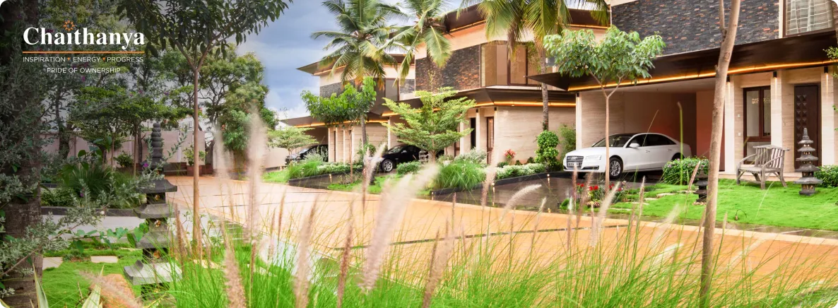 Chaithanya offers both villa communities and large-format vertical homes. Chaithanya Samarth reflects a vision of conscious villa living. Spread across a vast landscape, it supports solar-powered villas, open spaces, and strong community planning.