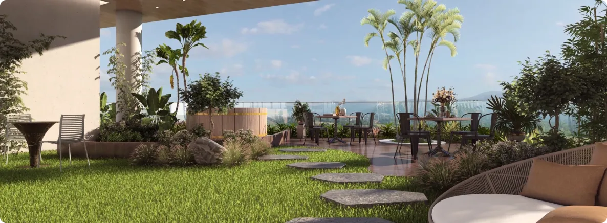 Lighting also enhances large decks like the garden decks at Chaithanya Sānkhya, where natural light stays strong during the day and soft lighting shapes calm evenings.